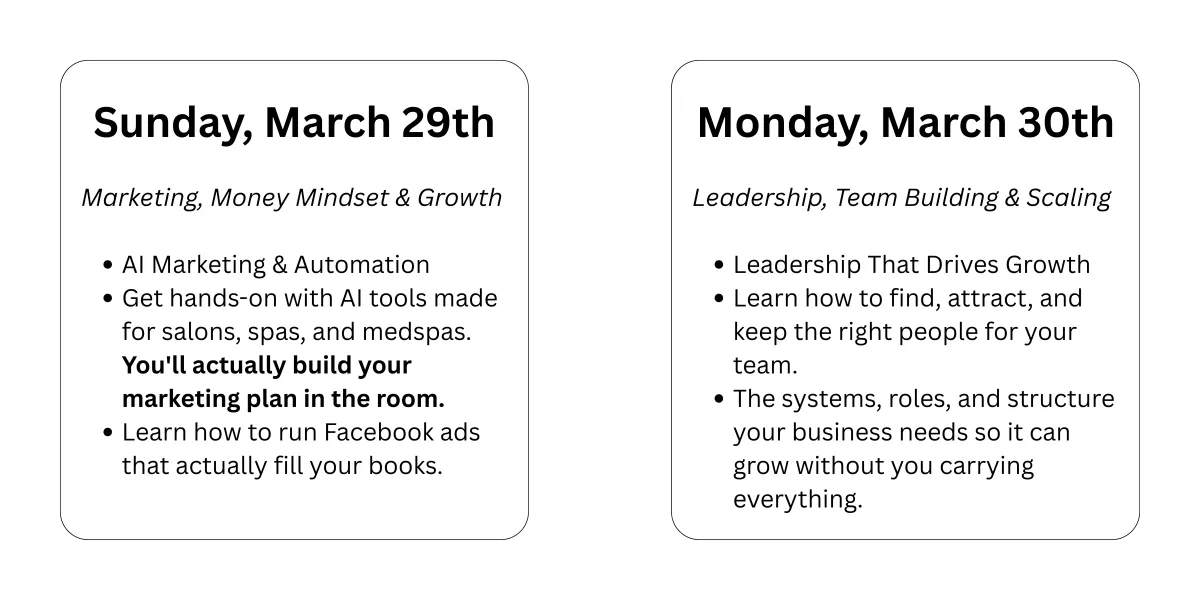 This event is specifically designed for the full spectrum of beauty and wellness businesses, salons, spas, medspas, and regenerative medicine practices. The financial systems, team structures, and growth strategies apply across all of these verticals. You’ll be in a room with peers who understand your world.